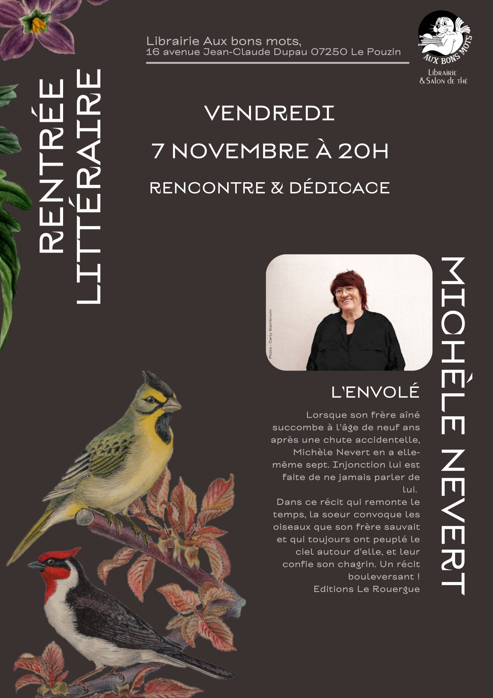 Rencontre, discussion et dédicace avec l'autrice québécoise Michèle Nevert pour son livre "L'Envolé" (éditions Le Rouergue). Présentation du livre, échange avec l'autrice, buffet.