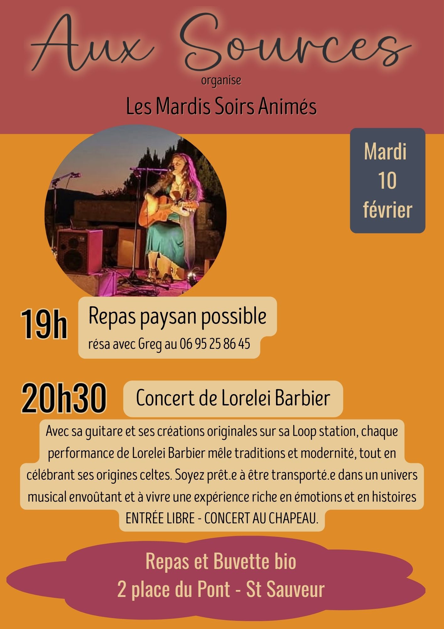 Aux Sources reçoit Lorelei Barbier pour un concert celte ! Avec sa guitare et ses créations originales sur sa Loop station, chaque performance de Lorelei Barbier mêle traditions et modernité, tout en célébrant ses origines celtes.
