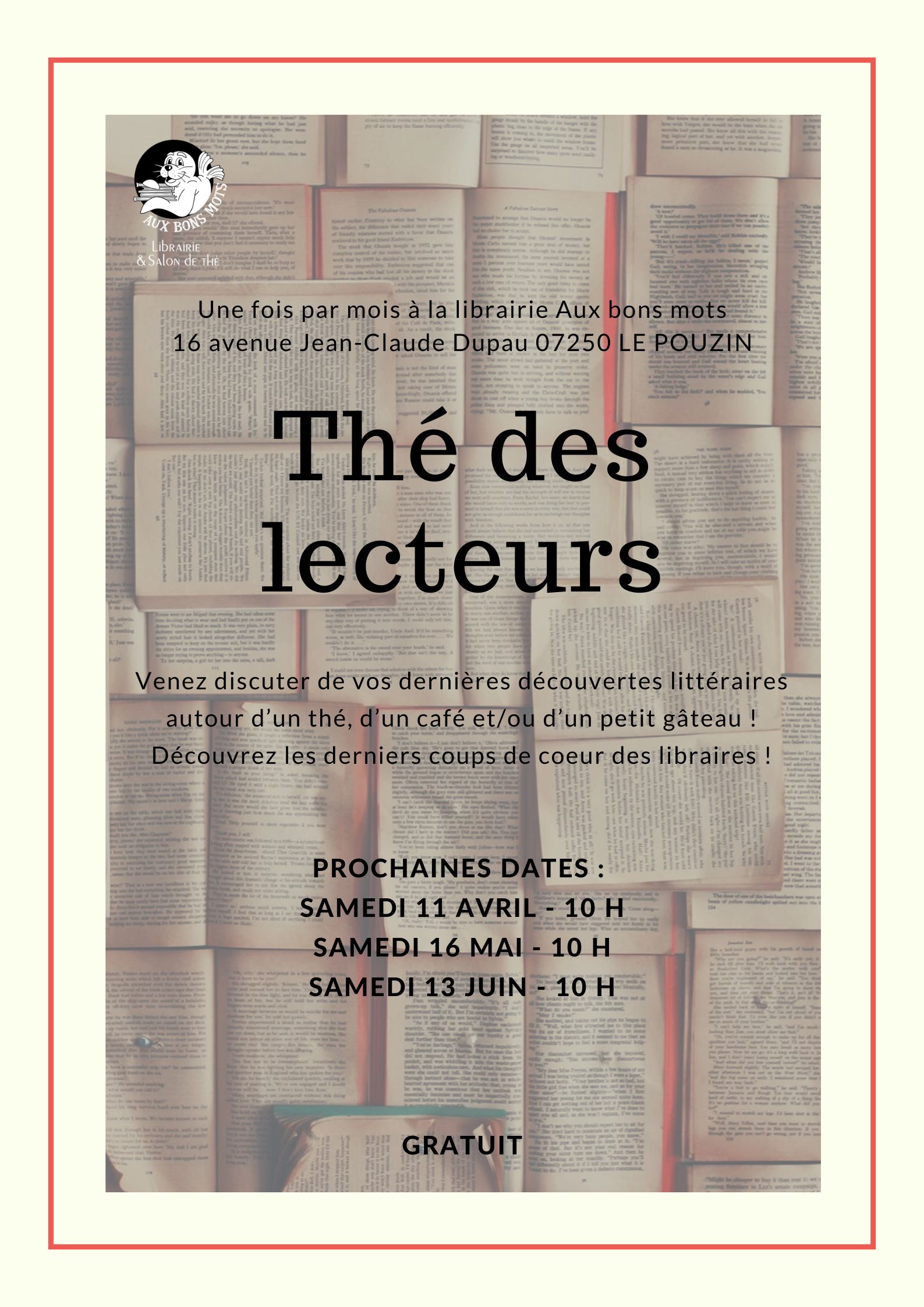 Une fois par mois, les lecteurs se retrouvent autour d'un thé pour discuter de leurs dernières lectures ! Venez présenter vos lectures préférées, ou simplement écouter les recommandations des autres lecteurs et repartez avec de nouvelles idées lecture ! Une rencontre gratuite, sans réservation nécessaire, en toute convivialité !