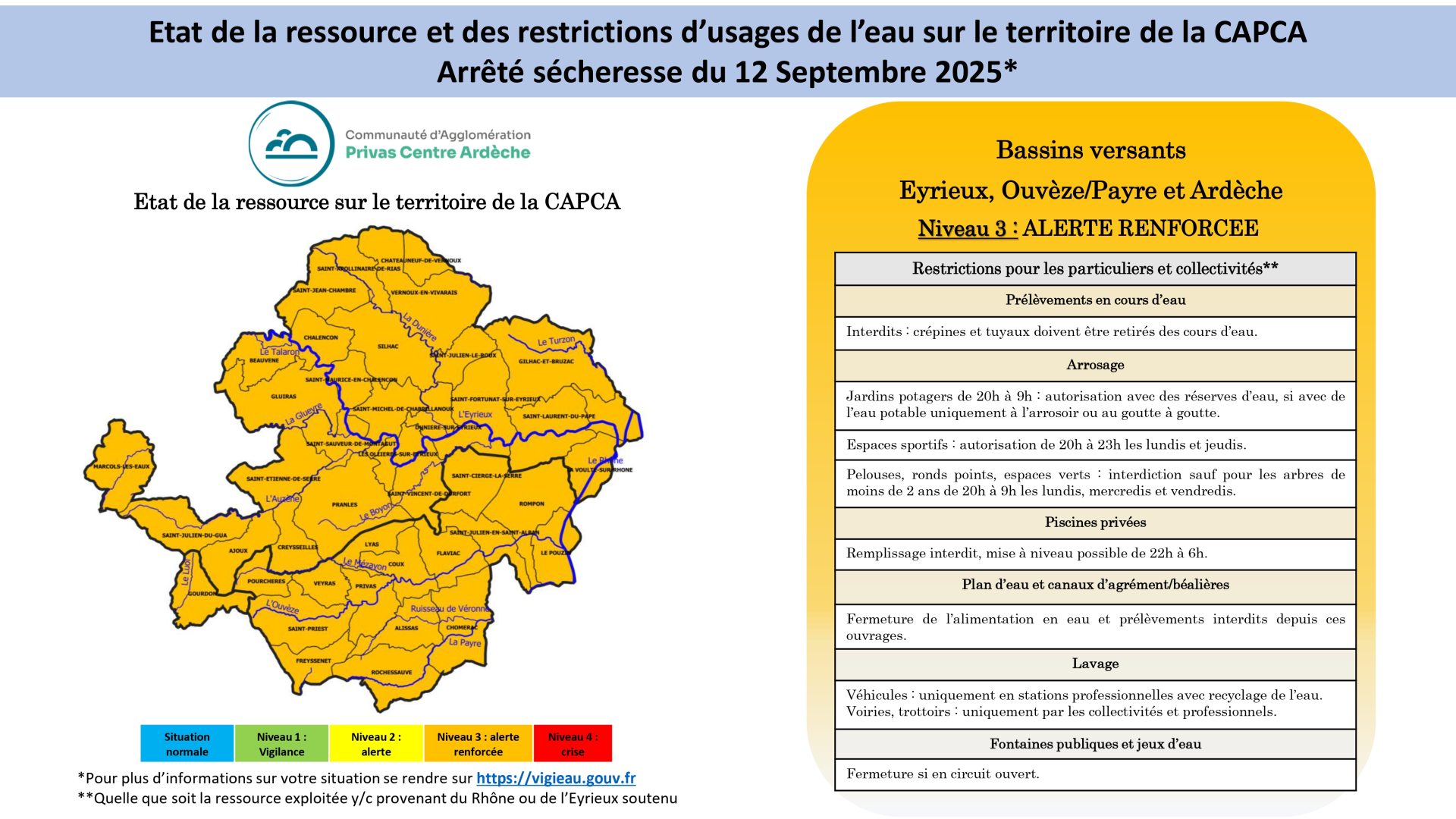 En lien avec les précipitations récentes, le niveau de restriction des usages de l’eau du bassin versant de l’Eyrieux a été assoupli. Il passe ainsi, du niveau « crise » au niveau « alerte renforcée ». Pas d’évolution néanmoins, sur le bassin versant de l’Ouvèze et de la Payre.