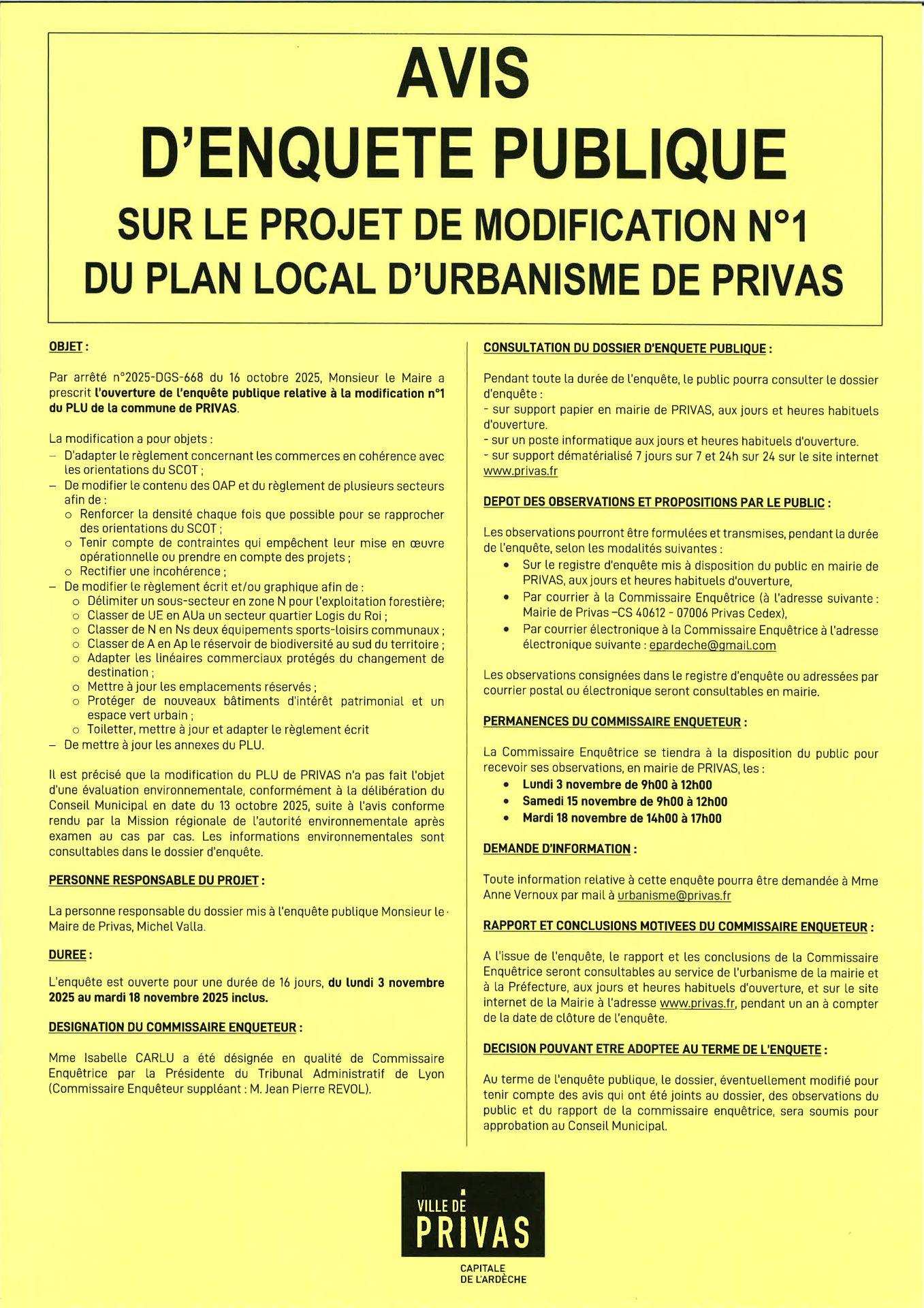 À la clôture de l’enquête, la Commissaire Enquêtrice rédigera son rapport et ses conclusions. Le dossier de modification n°1 du PLU, éventuellement ajusté pour tenir compte des observations recueillies, sera ensuite soumis à l’approbation du Conseil Municipal de Privas.
