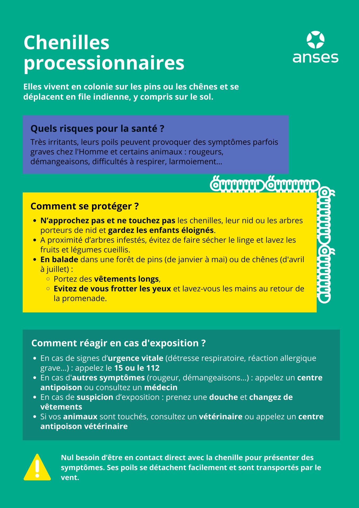 Les Processionnaires du Pin et du Chêne sont des papillons qui, au stade chenille, sont recouverts de poils urticants. Ces poils, que l’on retrouve sur les chenilles, dans les cocons, dans les nids et dans les sites d’enfouissement sont dangereux pour l’homme et les animaux domestiques. Ils peuvent être à l’origine de réactions parfois graves : respiratoires, cutanées, des muqueuses ou de l’œil.