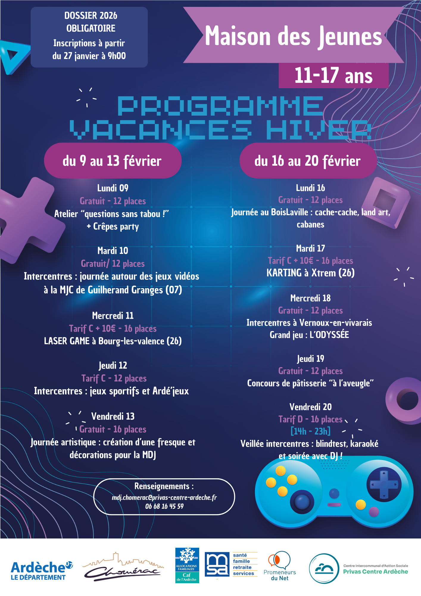 - Pour une première inscription veuillez envoyer le dossier d’inscription par mail à mdj.chomerac@privas-centre-ardeche.fr, pour connaître votre identifiant de connexion du portail famille.